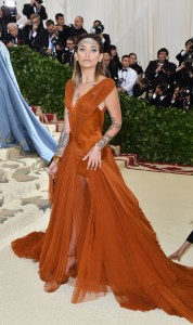 Image Credit: ANGELA WEISS/AFP via Getty Images. All eyes were on Jackson when she arrived at the 2018 Met Gala in this dramatic tired, pumpkin-colored ball gown from Stella McCartney.
