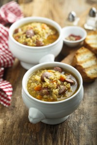 Image Credit: marysckin/Adobe Stock. Garten’s lentil sausage soup combines all of your favorite herbs and seasonings, like thyme and cumin, all of your favorite veggies, like garlic, leeks, and green lentils, and is topped with your favorite ingredient of all time, cheese.