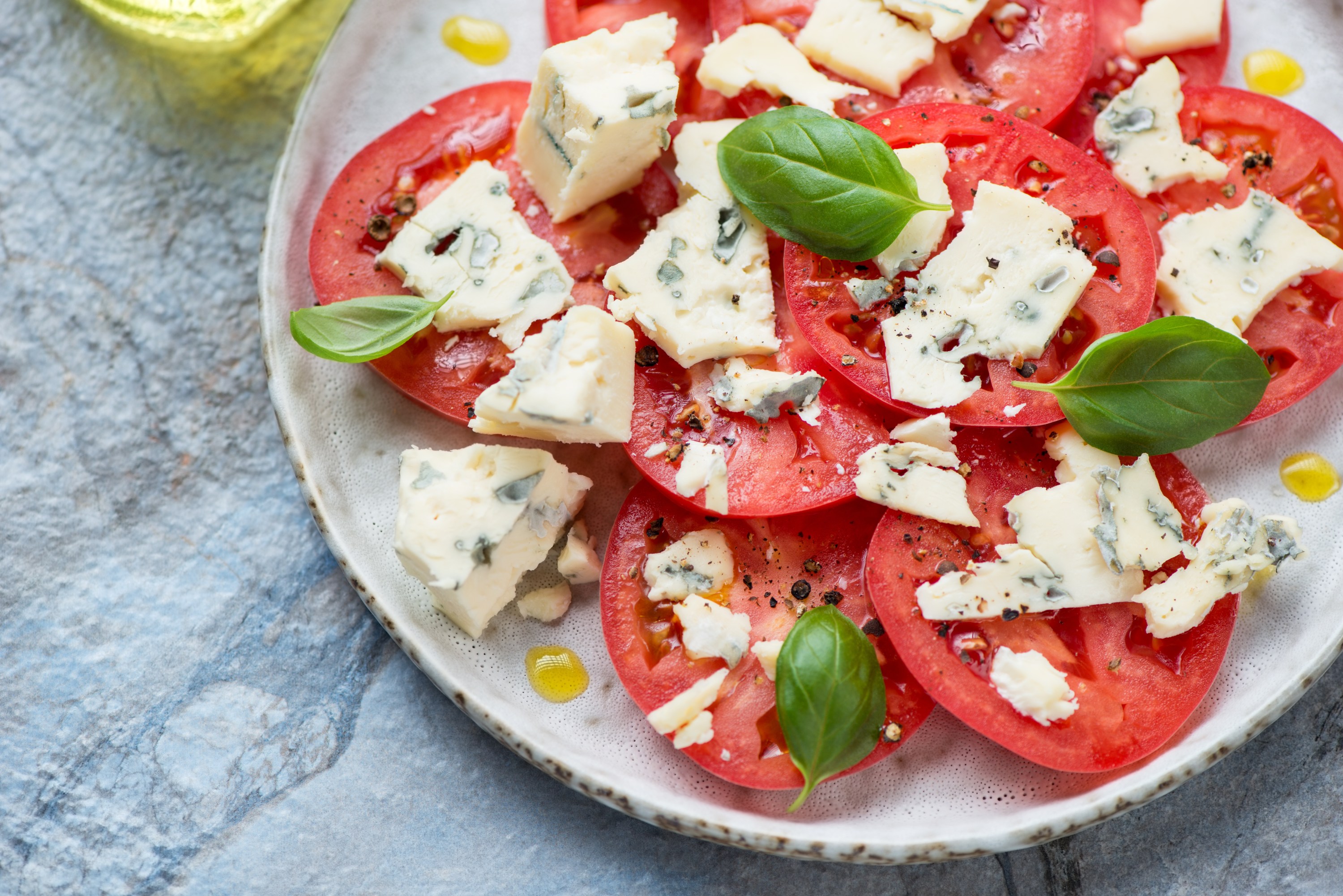 While tomatoes and mozzarella are a classic summer pairing, why not change things up by swapping the delicate mozzarella for some tangy blue cheese? It’s perfect for a fun take on an old classic. Plus, there’s no cooking involved!